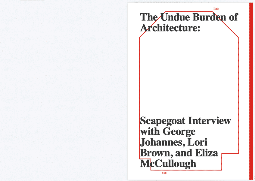 Issue 11 of Scapegoat: Journal of Architecture, Landscape, and Political Economy, was edited by Seth Denizen and Marcin Kędzior (Spring 2018). The Undue Burden of Architecture was published in this issue with contributors George Johannes, Lori Brown, and Eliza McCullough. Drawings for this interview are by Seth Denizen and were republished in 2020 with a new text by Elizabeth Evitts Dickinson, in: "Architecture, TRAP Laws, and the Battle Over Abortion." Architect Magazine: Journal of the American Institute of Architects, April 13, 2020.